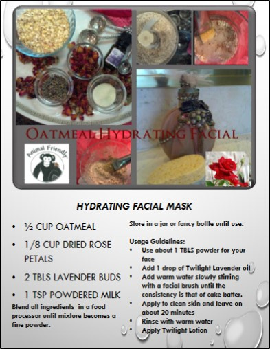 This oatmeal mask is healing and soothing to winter ravaged skin. It is one of the favorite facials I blended in the Salon and in workshops. Whenever possible use organic or certified organic ingredients.